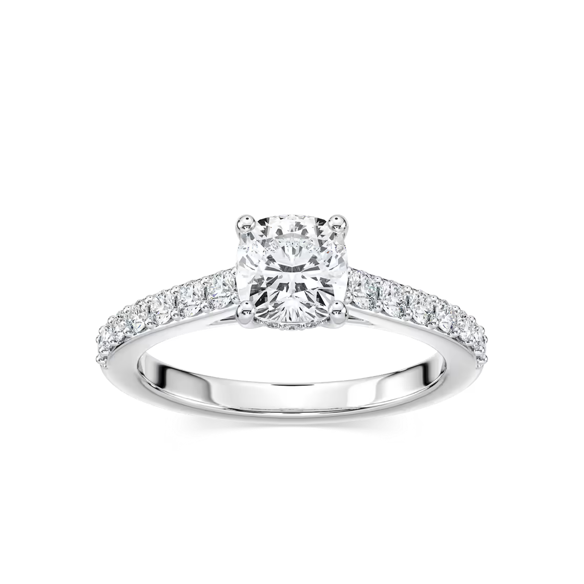 Cushion Shared Prong Engagement Ring with Hidden Halo