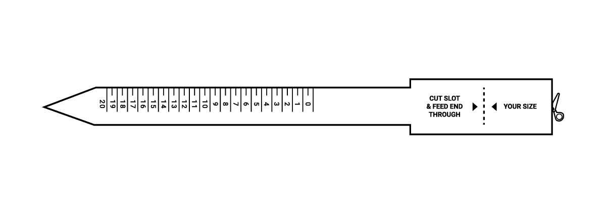 Push the end of the sizer through the buckle to form a ring shape and slip it onto the finger. Tighten until it is comfortably snug but not tight. Then read the size through the magnifier and you will have found the correct ring size.