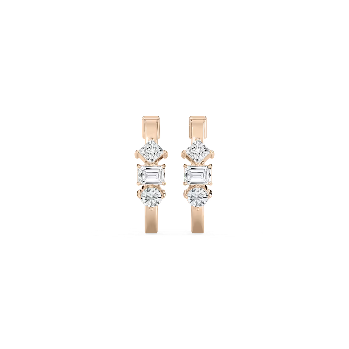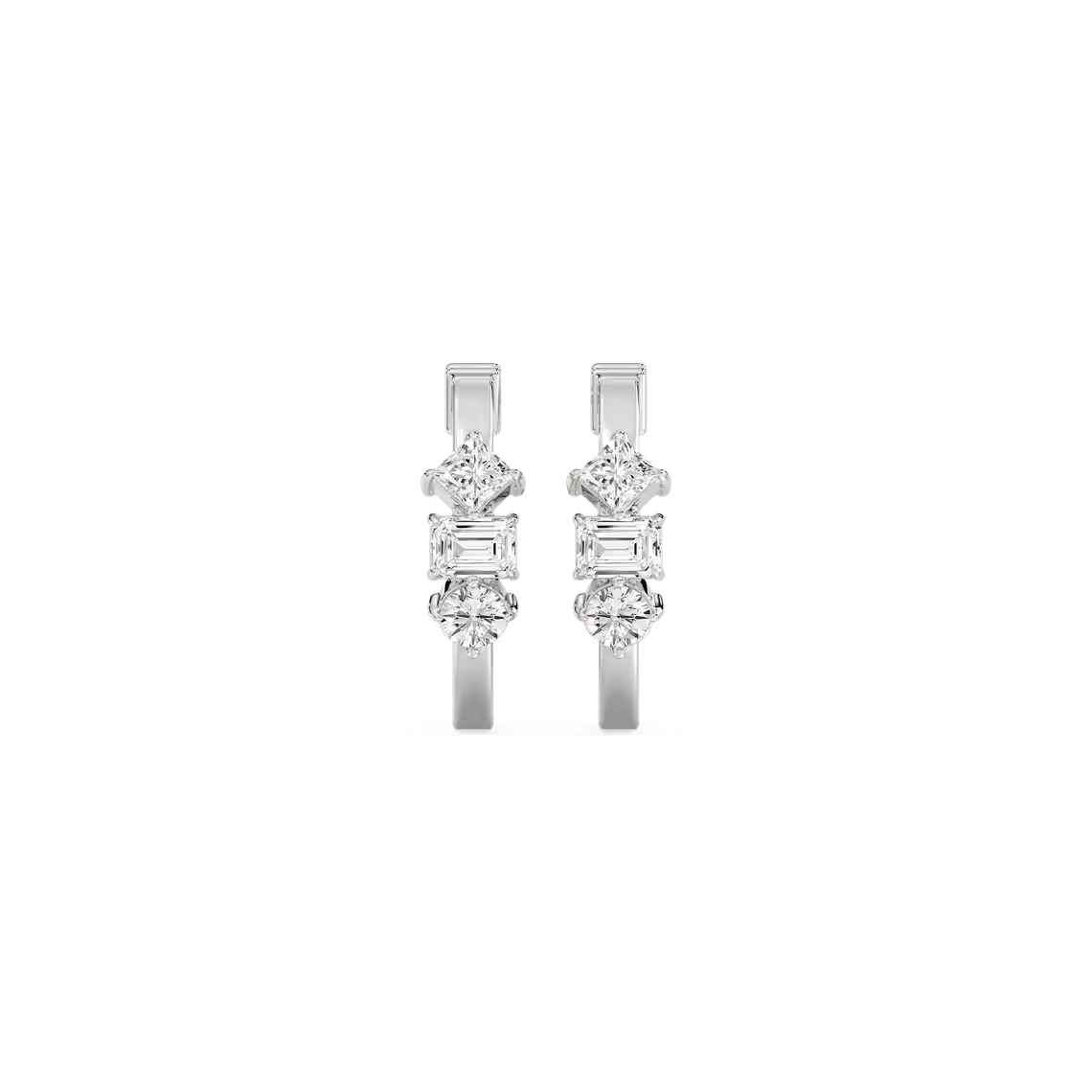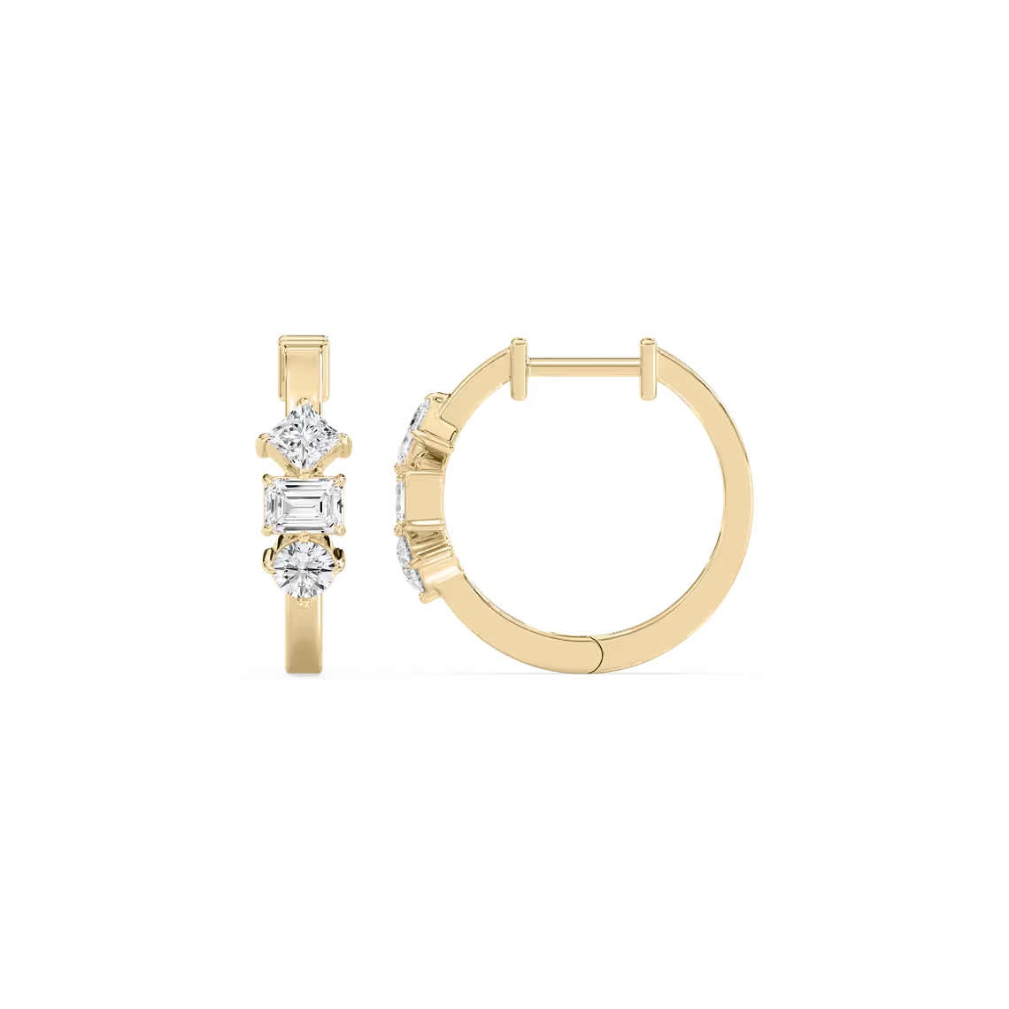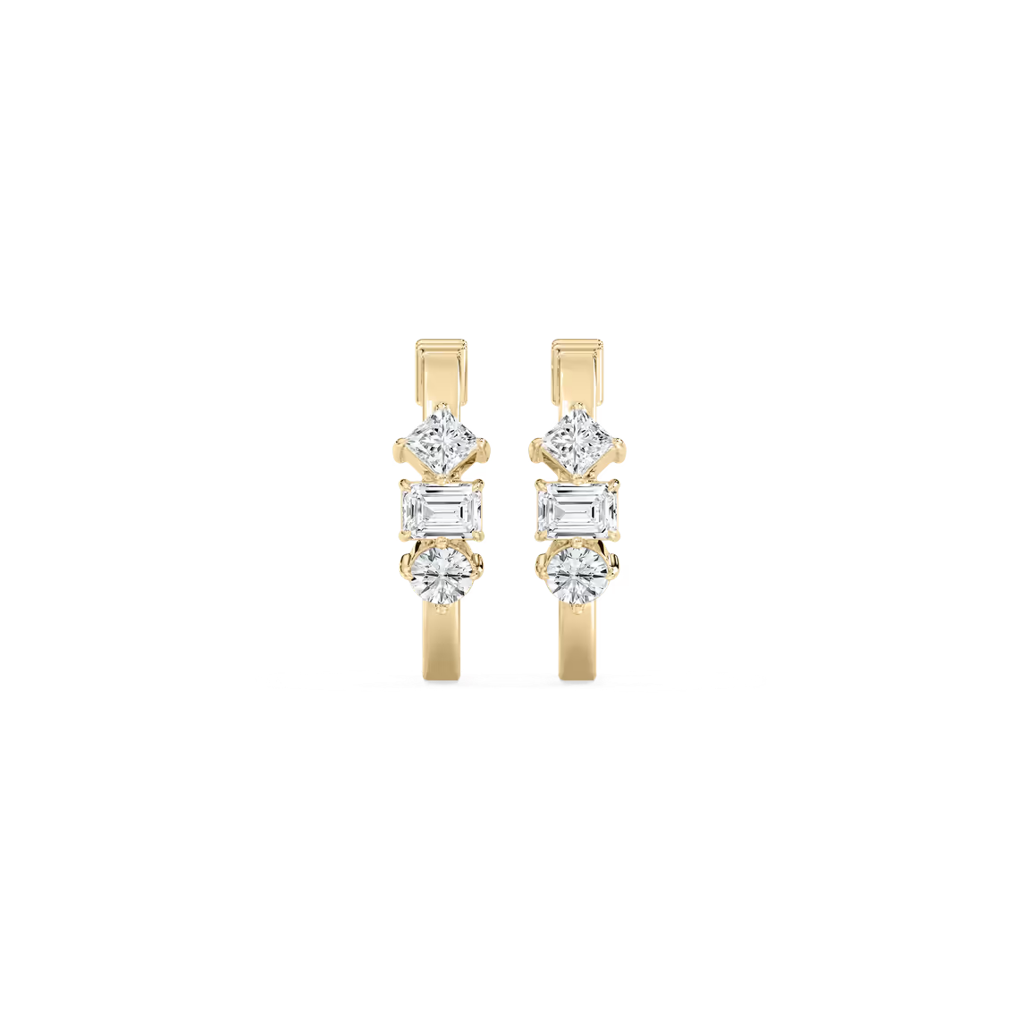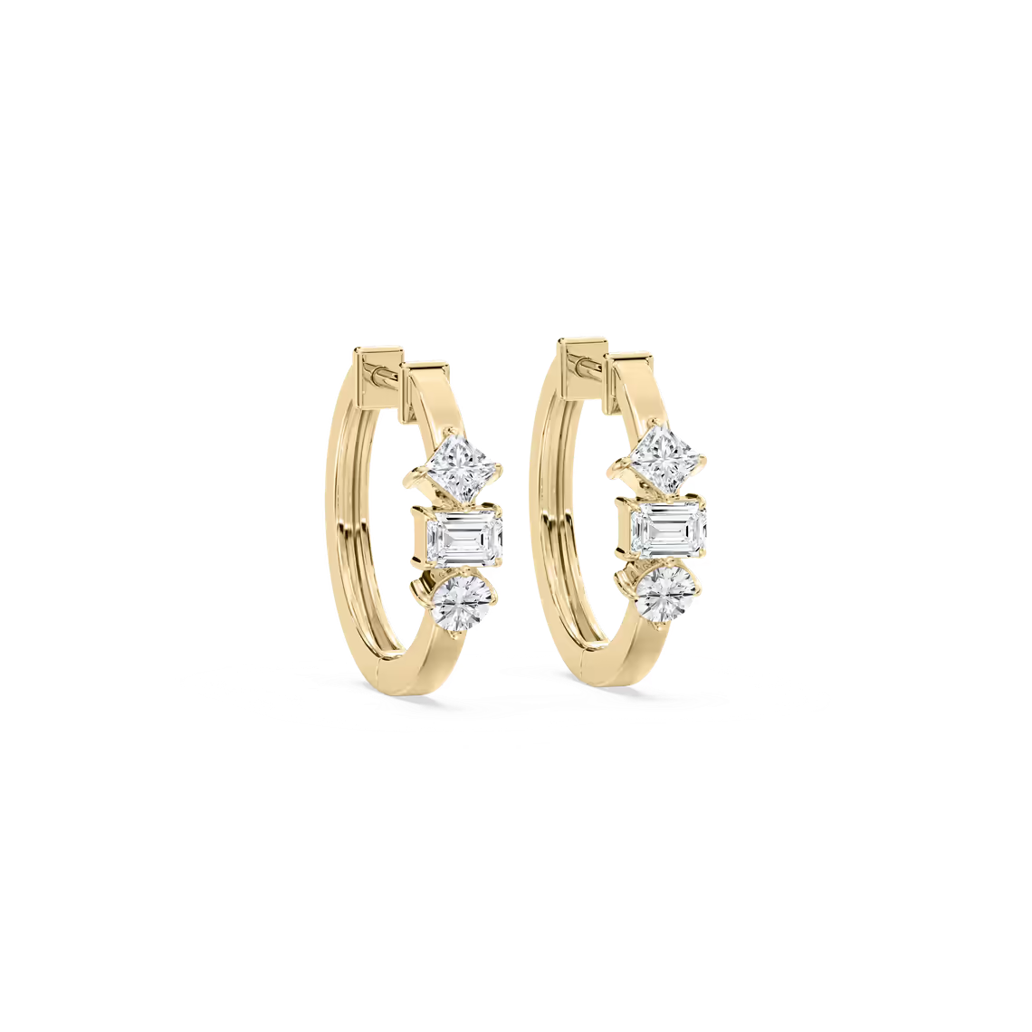 Chic and contemporary, these huggie hoop earrings showcase a captivating trio of lab-grown diamond cuts—round, princess, and emerald—creating a multidimensional sparkle that catches the light from every angle. Expertly crafted in your choice of 18K white, yellow, or rose gold, they embody effortless sophistication and bring a touch of everyday luxury to any look.